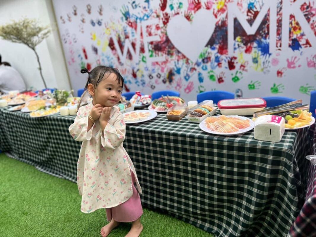 Ngoài ra, trường mầm non trên cũng tổ chức những bữa ăn bán trú theo mô hình bữa cơm gia đình. Mỗi bàn ăn gồm 5 bé, các món ăn đặt trên bàn để các con tự lấy. Qua đó, trẻ có cảm giác như ở nhà, vừa ăn cơm, vừa trò chuyện với nhau và phát triển tinh thần đồng đội, kết nối tình thân.