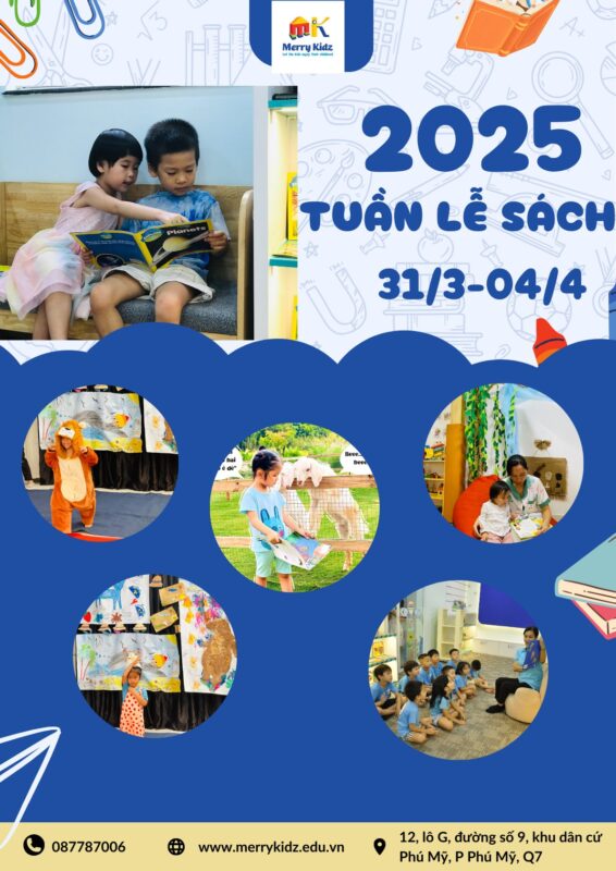 Trong tuần này (từ 31/03 đến 04/04), các bé trường Merry Kidz sẽ tham gia vào TUẦN LỄ SÁCH 2025. Đây là hoạt động thường niên của trường nhằm giúp các bé hiểu tầm quan trọng của việc đọc sách, gieo niềm đam mê và thói quen đọc sách. Nhà trường sẽ tổ chức nhiều hoạt động liên quan đến sách như sau: